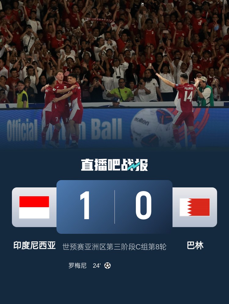 3月26日訊 18強賽C組第8輪,印尼隊主場1-0擊敗巴林隊,以9個積分暫居C組第4,繼續(xù)追趕身前的沙特和澳大利亞。