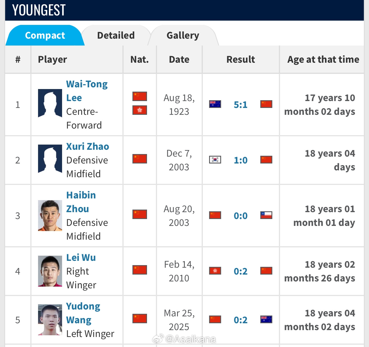不算上古大神的話,王鈺棟在國足A級最年輕出場里排在第四(18歲4個月)。趙旭日(18歲零4天)、周海濱(18歲1個月)、武磊(18歲2個月)分列前三。