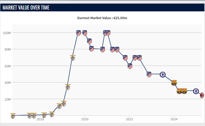 菲利克斯2500萬歐的身價也是2019年之后的新低,菲利克斯2019年巔峰身價曾達1億歐,在2021年之后身價一直在下降。