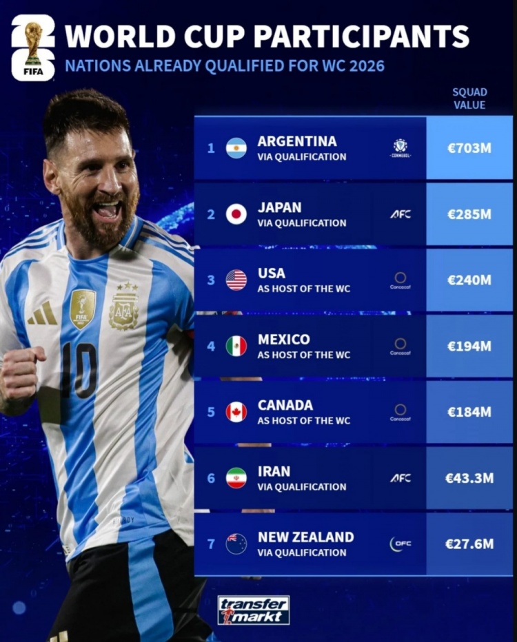已獲世界杯資格球隊(duì)身價榜:阿根廷7.03億歐居首,日本、美國前三