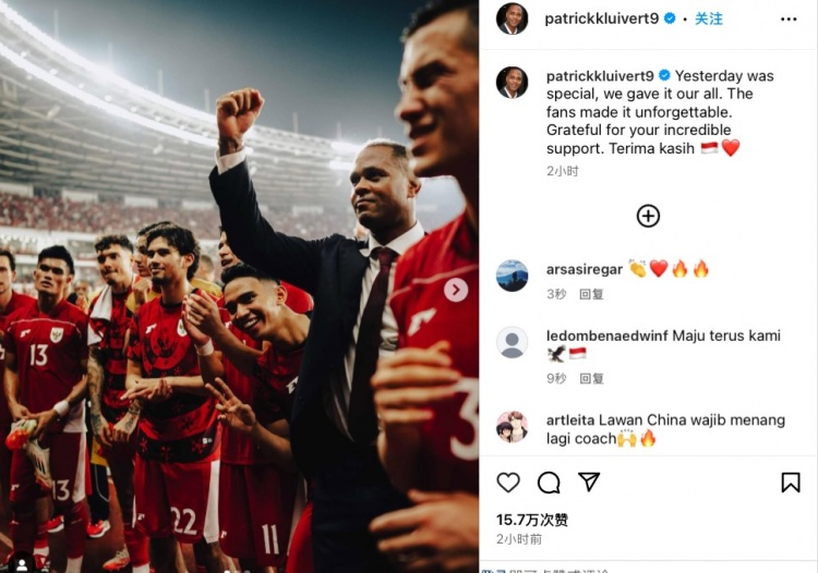 今日克魯伊維特更新社媒,曬出了全隊圍在一起慶祝勝利的照片,并配文寫道:“昨天是特別的一天,我們在場上傾盡所有,球迷們的加油助威讓這晚更加難忘。謝謝你們令人振奮的支持,感謝(印尼語)?!?/p>
