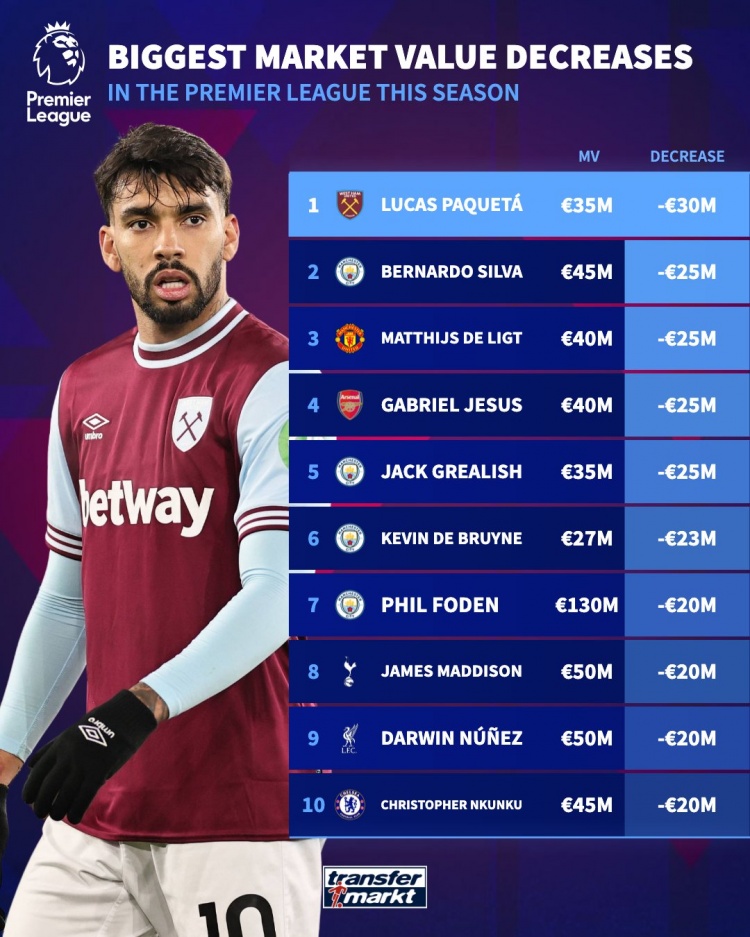 本賽季英超身價下跌榜:帕奎塔3000萬歐,B席、德里赫特2500萬歐