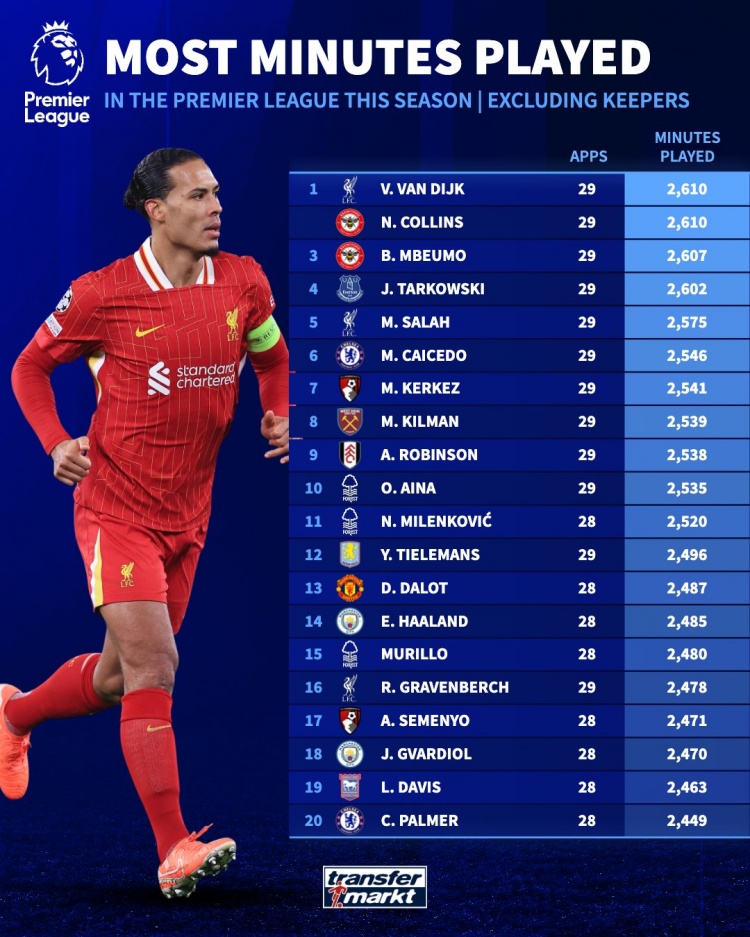 英超外場球員出場榜:范迪克打滿29場居首,薩拉赫第5、凱塞多第6