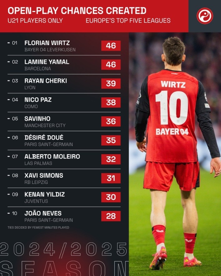 五大聯賽U21運動戰(zhàn)創(chuàng)造機會排行:亞馬爾、維爾茨46次并列榜首