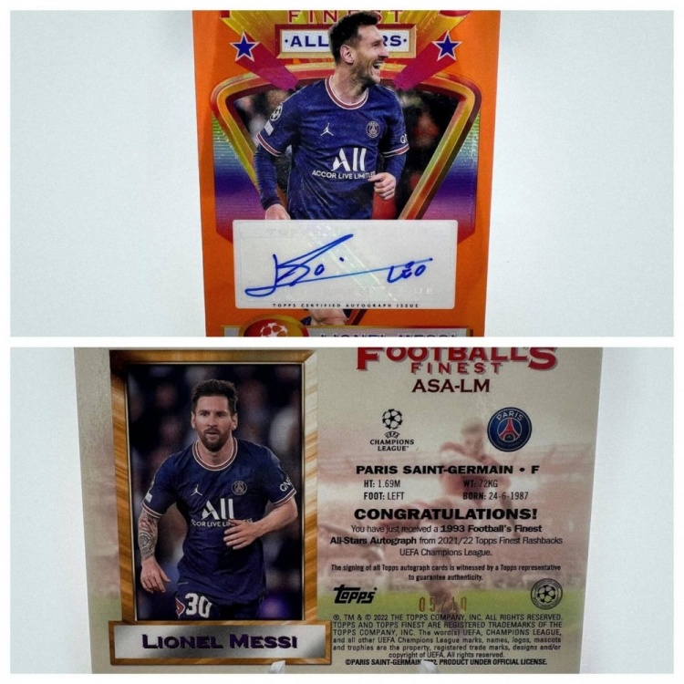 這張2021-22賽季Topps Finest Flashbacks UEFA Champions League Football’s Finest全明星簽名橙折射卡,全球僅印制10張。正面小字標(biāo)注著“Topps認(rèn)證簽名版本”??ㄆ趁孢€提供了更多保證:“所有Topps簽名卡的簽署過程均有Topps代表現(xiàn)場監(jiān)督,確保真實(shí)性?!边@張卡片潛在價(jià)值超過1000美元。