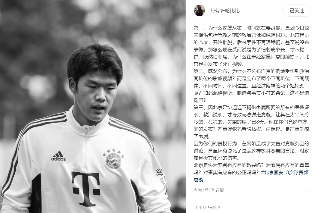 郭嘉璇家屬質(zhì)問北京足協(xié):為何視頻不連貫?直升機(jī)40-80分鐘才到