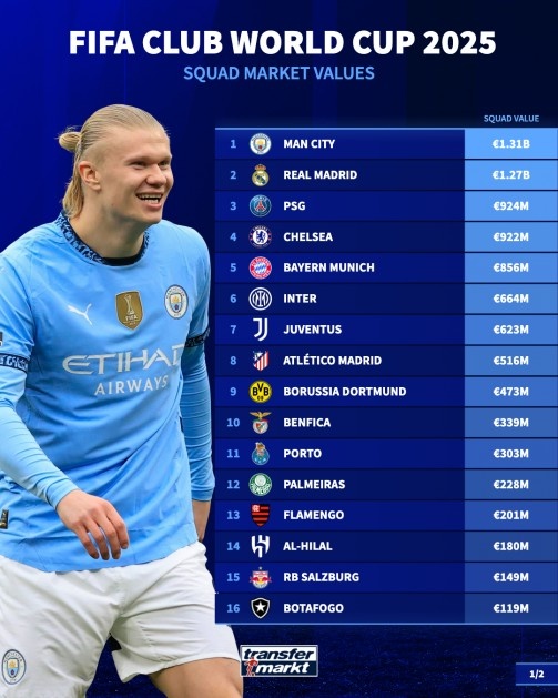 世俱杯參賽球隊(duì)身價排行:曼城13.1億歐居首 皇馬巴黎藍(lán)軍拜仁2-5