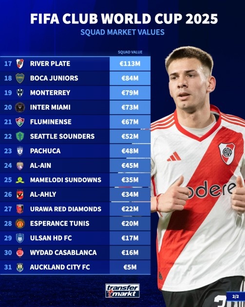 3月27日訊 德轉(zhuǎn)列已經(jīng)確定參加今年世俱杯的31隊(duì)身價排名,曼城、皇馬、巴黎排在前三,17支球隊(duì)總身價過億。
