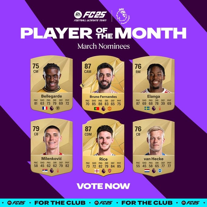 3月27日訊 英超聯(lián)賽今天公布了3月份最佳球員候選名單,B費、賴斯領銜。