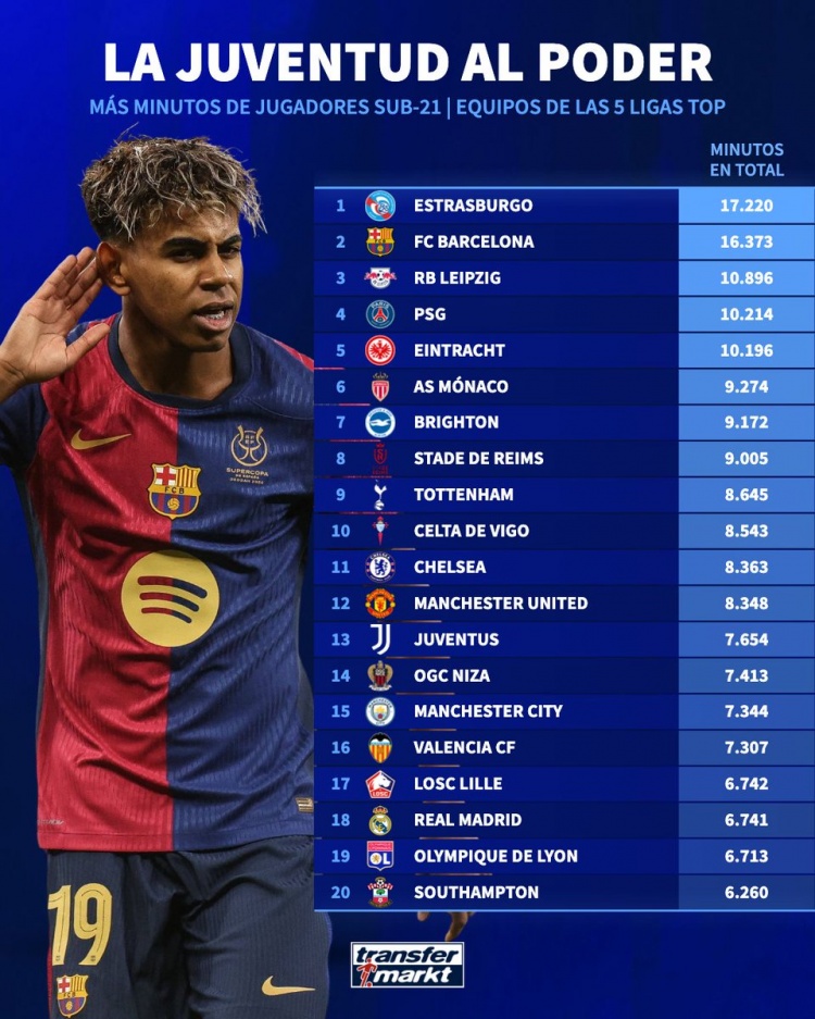 3月27日訊 德國轉(zhuǎn)會(huì)市場(chǎng)統(tǒng)計(jì)了本賽季五大聯(lián)賽球隊(duì)U21球員的總出場(chǎng)時(shí)間,并列出榜單,斯特拉斯堡居首,巴塞羅那、萊比錫排名二三位。