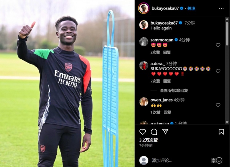 - 接近復(fù)出,薩卡社媒曬身穿訓(xùn)練服照片:又見(jiàn)面了