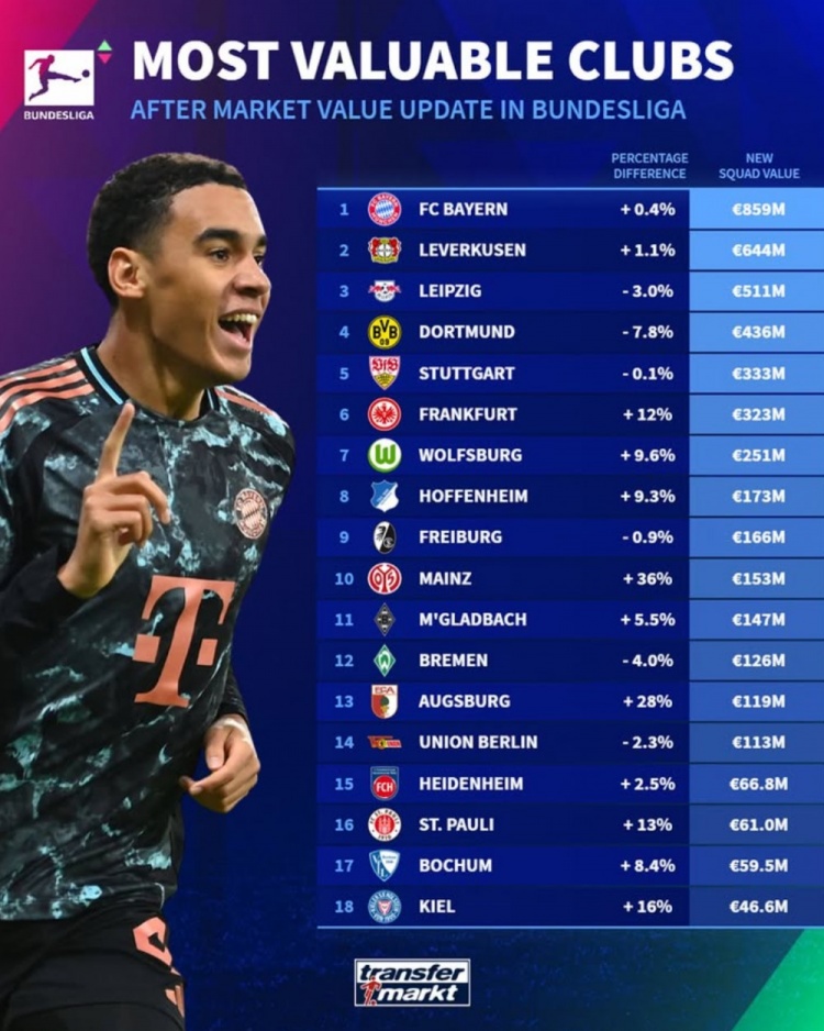 德甲球隊(duì)德轉(zhuǎn)身價(jià)榜:拜仁8.59億歐居首,藥廠萊比錫二三位