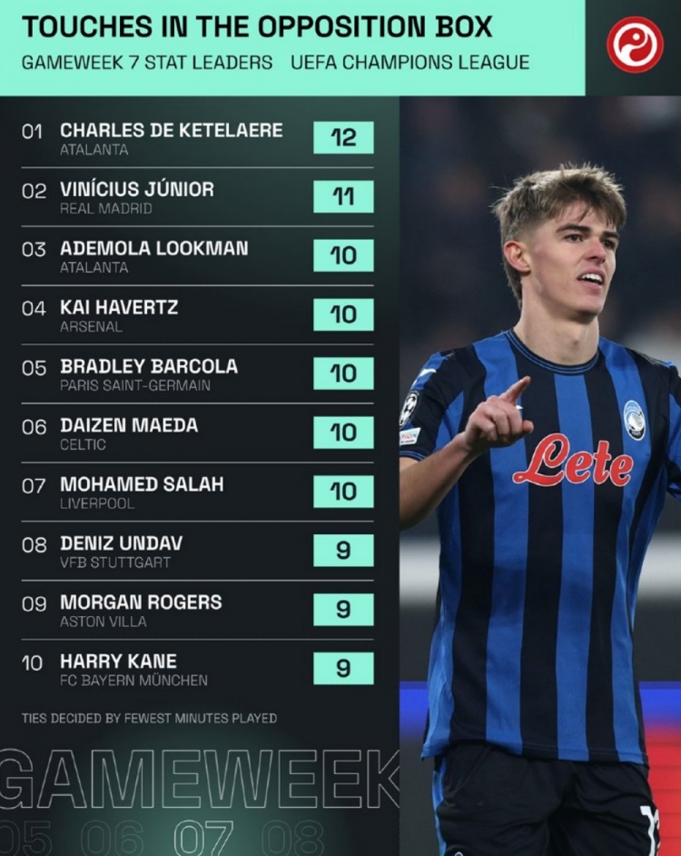 本輪歐冠在對(duì)手禁區(qū)觸球排行榜:CDK12次居首,維尼修斯11次第二