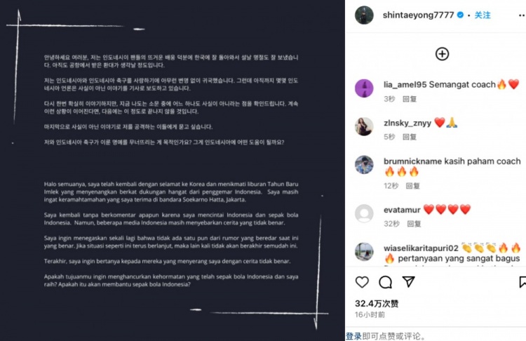2月2日訊 今日前印尼主帥申臺(tái)龍更新社媒,用韓語和印度尼西亞語發(fā)布聲明,對部分印尼媒體進(jìn)行警告。