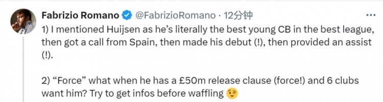 羅馬諾回復(fù)道:“第一,我提到懷森是因?yàn)樗_實(shí)是最佳聯(lián)賽中最為出色的年輕中衛(wèi),他得到西班牙隊(duì)的征召,然后上演了國(guó)家隊(duì)的首秀,并送出助攻?!?/p>
