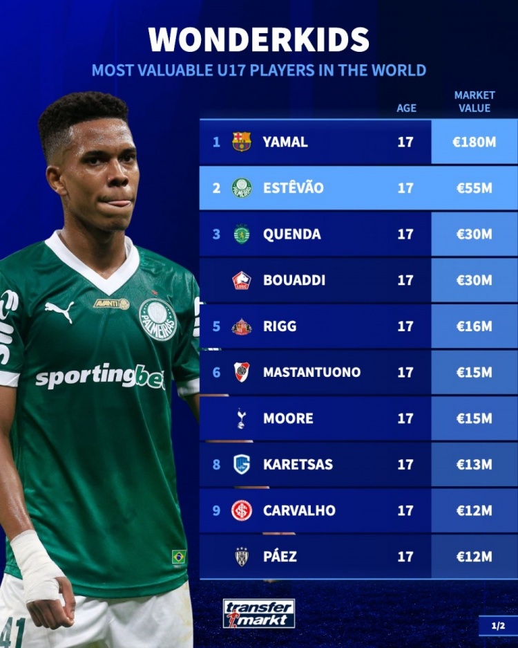 德轉(zhuǎn)U17身價榜:亞馬爾1.8億斷崖領(lǐng)跑,切爾西預(yù)訂埃斯特旺等多人