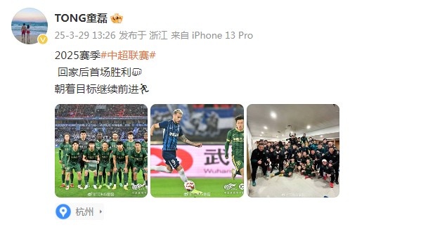 3月29日訊 在中超聯(lián)賽第3輪中,浙江隊(duì)客場(chǎng)4-0大勝武漢三鎮(zhèn),本場(chǎng)也是浙江隊(duì)在本賽季的首勝。比賽結(jié)束轉(zhuǎn)天,童磊更新微博,慶祝球隊(duì)取勝。