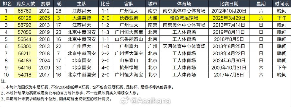 大連英博和長春亞泰吸引60126名觀眾現(xiàn)場觀戰(zhàn),中超歷史排名第二