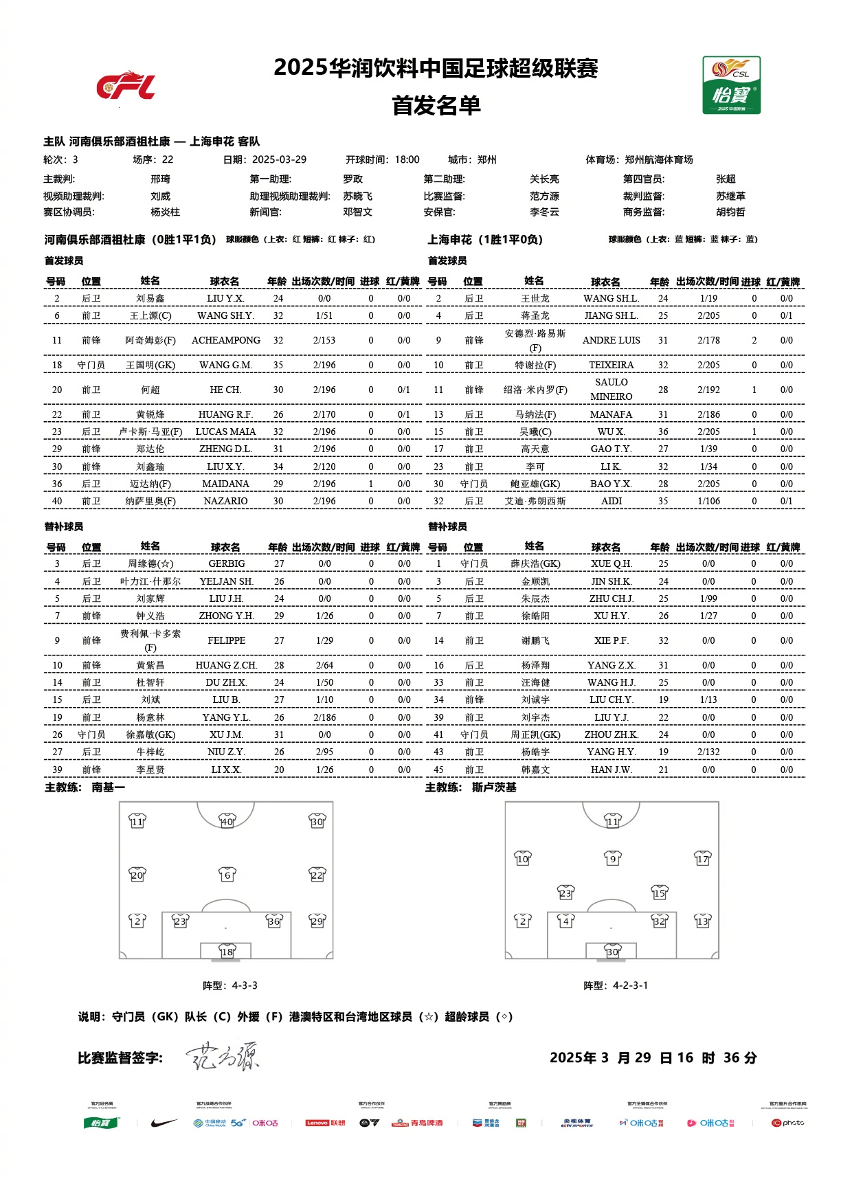 - 中超聯(lián)賽第3輪 河南俱樂部酒祖杜康vs上海申花 首發(fā)名單 ???