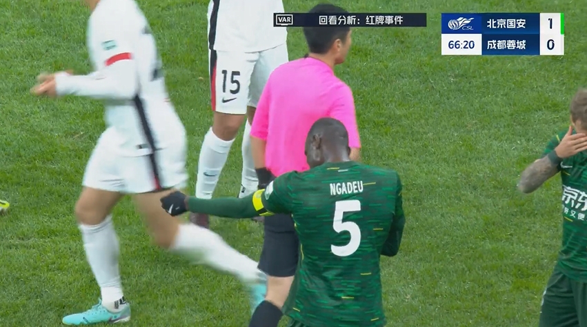 比賽第66分鐘,恩加德烏后場拿球被搶斷,無奈放倒費利佩犯規(guī),主裁馬寧起初出示黃牌,隨后VAR介入,馬寧去場邊查看后改判直紅!場上比分國安1-0蓉城。