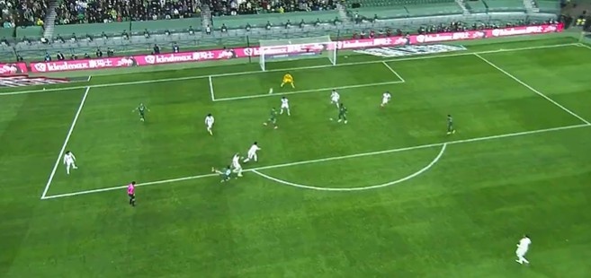 第31分鐘,楊立瑜左路弧頂內(nèi)切兜射被防守球員擋出底線?!?/p>