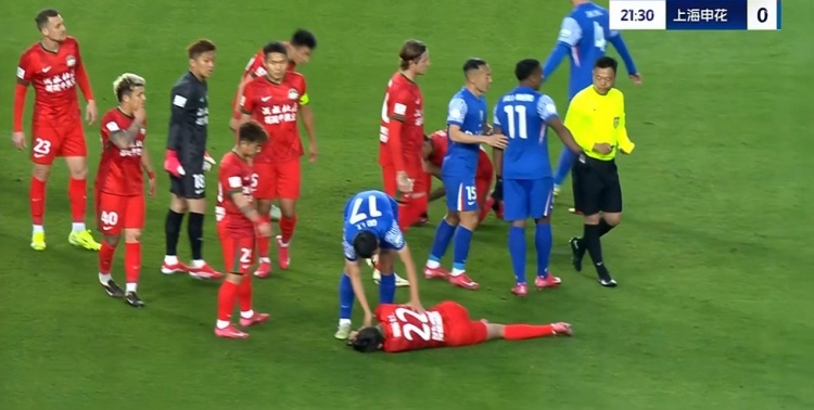 第23分鐘,申花左側(cè)角球機會,禁區(qū)內(nèi)卡位時路易斯故意推搡黃銳烽,后者倒地,主裁黃牌警告路易斯↓