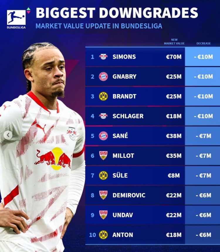 德轉(zhuǎn)列身價(jià)更新后德甲貶值榜:歐元