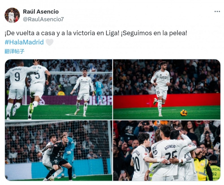 勞爾-阿森西奧社媒曬出比賽照片,并配文:“回到主場(chǎng),在聯(lián)賽中取得勝利!我們?nèi)栽趹?zhàn)斗!”