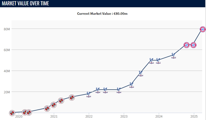 2024年夏窗,拜仁花費(fèi)5300萬歐元從水晶宮簽下奧利塞,合同簽至2029年6月。本賽季奧利塞代表拜仁出戰(zhàn)41場(chǎng)比賽,貢獻(xiàn)13粒進(jìn)球和13次助攻。