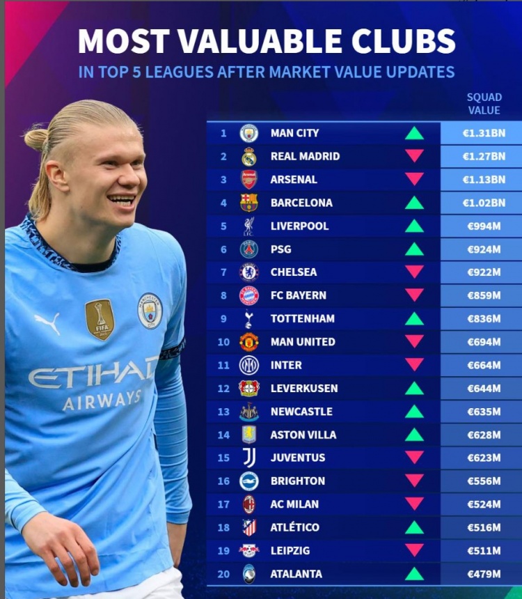 五大聯(lián)賽球隊最新身價榜:曼城壓皇馬居首,阿森納、巴薩分列三四