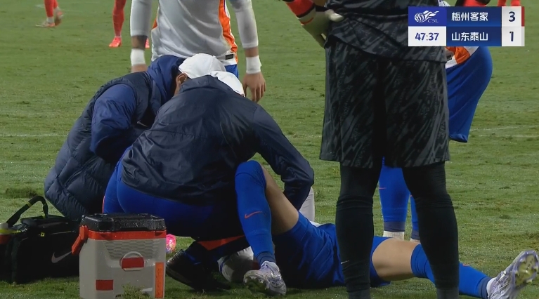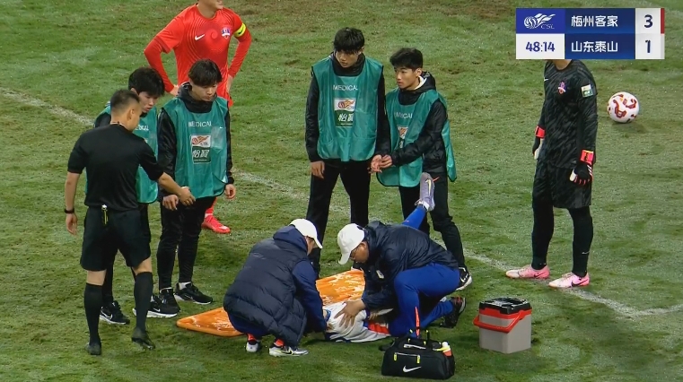 3月29日進(jìn)行的中超第3輪比賽,泰山vs梅州第50分鐘,王彤遠(yuǎn)射后為了躲避封堵失去平衡摔地,隨后被擔(dān)架抬下,張弛替補登場。
