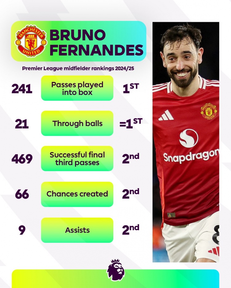 3月31日訊 英超官方列出了B費(fèi)本賽季的數(shù)據(jù),B費(fèi)將球傳入禁區(qū)、直塞次數(shù)英超中場(chǎng)球員中最多,創(chuàng)造機(jī)會(huì)、助攻次數(shù)第二多。