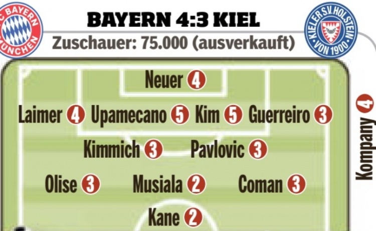 圖片報(bào)拜仁賽后評(píng)分:凱恩、穆西亞拉獲好評(píng),金玟哉、于帕最低分