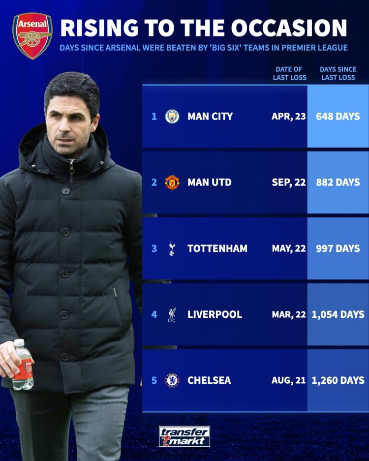 阿森納上一次英超輸給BIG6球隊(duì)還是在648天之前,對(duì)手就是曼城