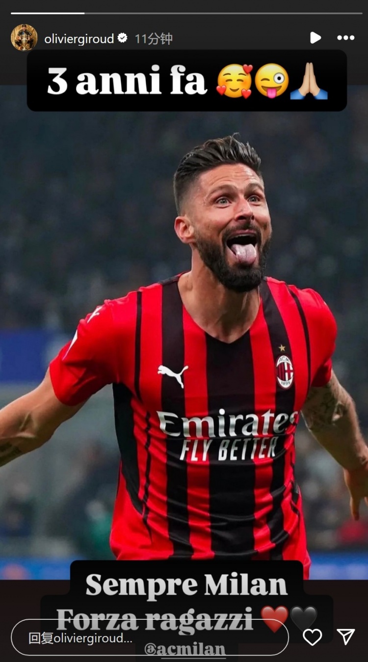吉魯在社交媒體上曬出自己當(dāng)時(shí)慶祝進(jìn)球的照片,配文:“三年前。永恒的米蘭,加油兄弟們!”