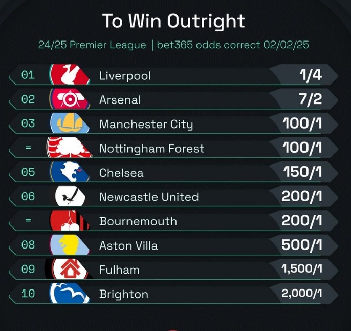 英超最新奪冠賠率:利物浦高居榜首,阿森納次席&與曼城差距拉大