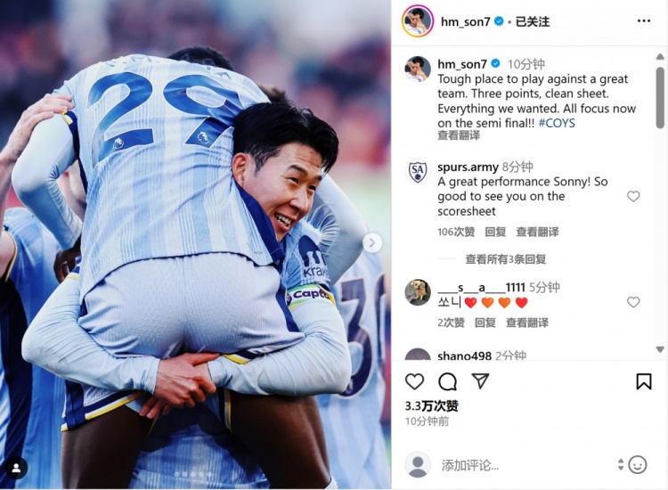 本場比賽孫興慜一次造烏龍還有一次助攻,賽后他也在個(gè)人社媒曬出與隊(duì)友相擁慶祝的照片,配文寫道:“一個(gè)艱難的客場面對一支出色的球隊(duì),拿下三分,完成零封,這是我們?nèi)肯胍?,現(xiàn)在集中注意在聯(lián)賽杯半決賽?!?/p>