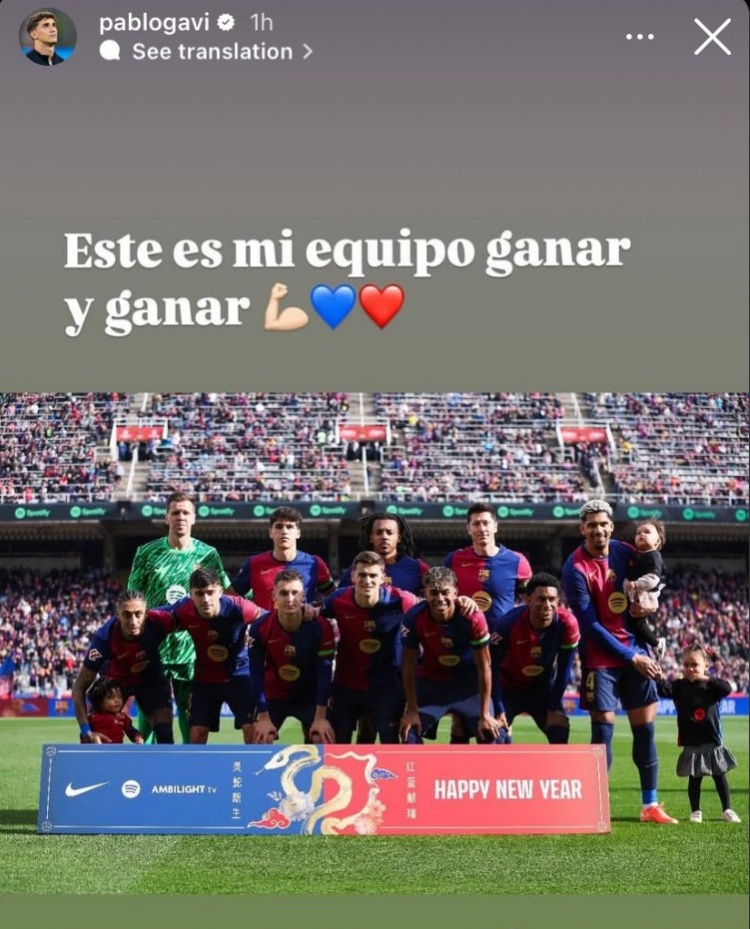 本場比賽巴薩球員加維與對手頭部相撞后被抬離出場,在接受檢查后已獲準回家休養(yǎng)。加維在個人社媒曬出全隊賽前合影,配文寫道:“這就是我的球隊,一直贏下去!”