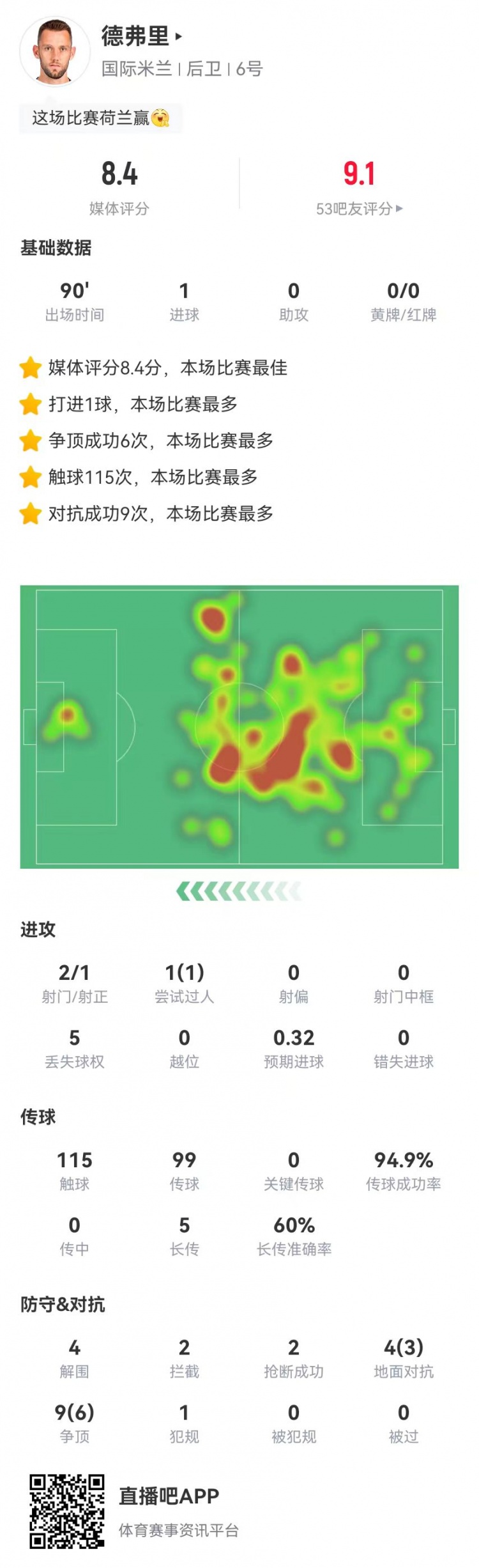 德弗里本場1球+4解圍2封堵2攔截2搶斷0被過 獲評8.4分全場最高