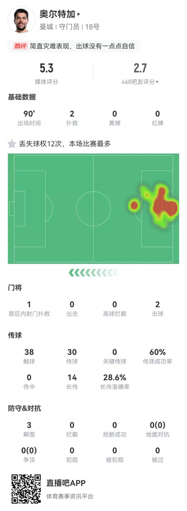 2月3日訊 曼城在本輪英超1-5慘敗阿森納,奧爾特加本場(chǎng)數(shù)據(jù)如下: