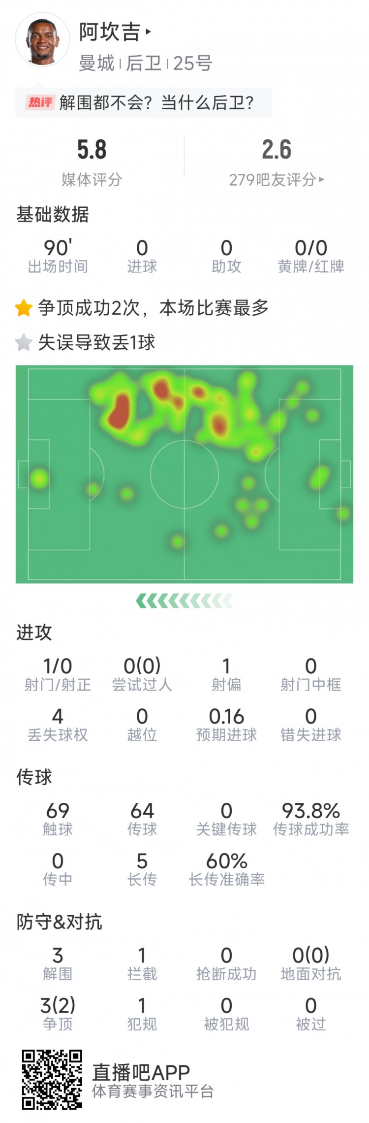 阿坎吉本場數(shù)據(jù):失誤導致丟球,3次解圍,1次攔截,評分5.8分