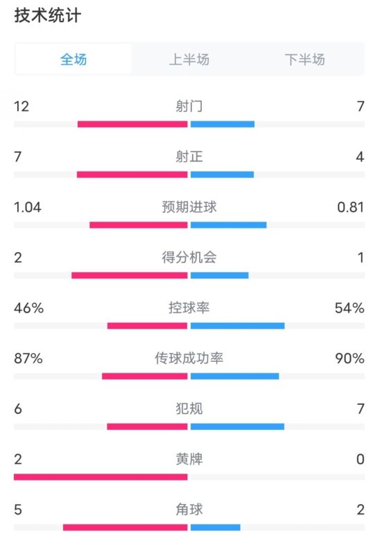 全場比賽數(shù)據(jù)如下(阿森納在前):