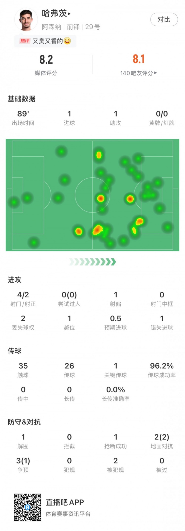 哈弗茨全場數(shù)據(jù)如下: