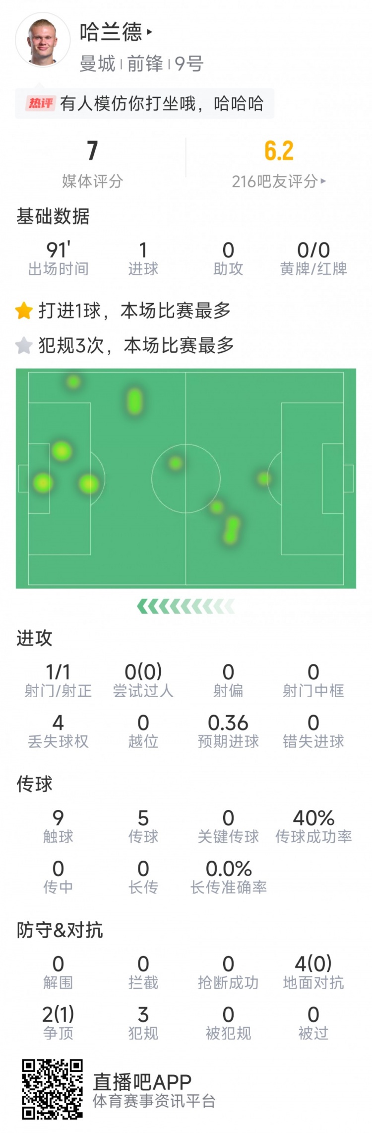 2月3日訊 在本輪英超,曼城1-5不敵阿森納,哈蘭德打進(jìn)一球,以下為他在本場數(shù)據(jù):