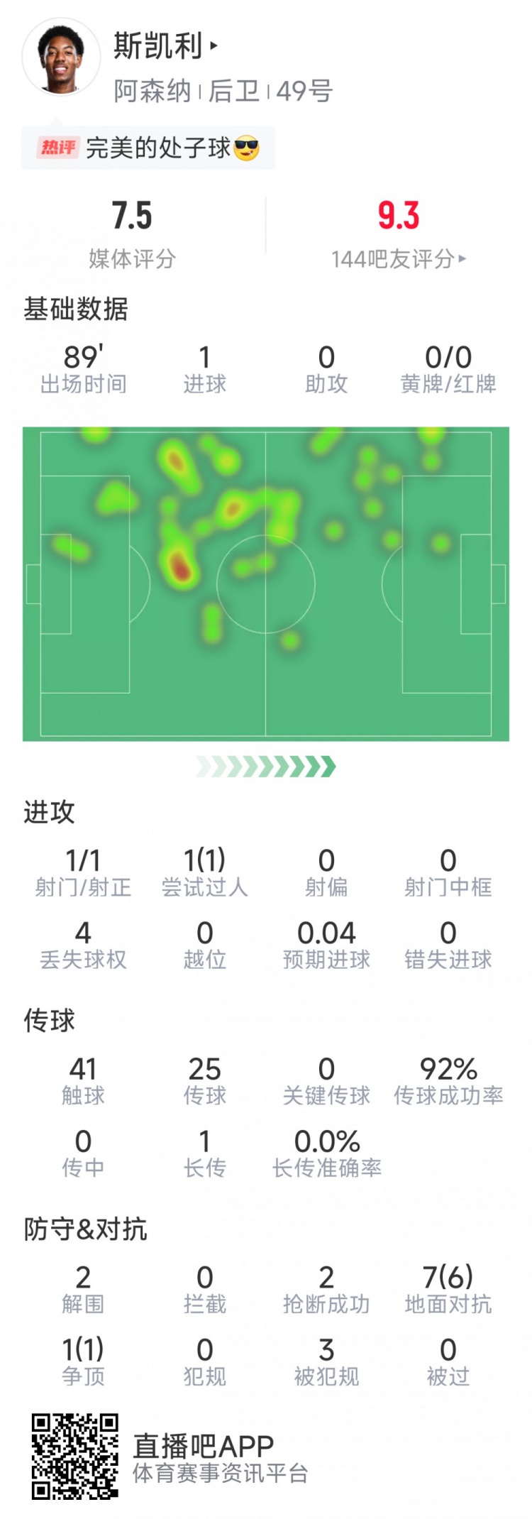 2月3日訊 在本輪英超阿森納對陣曼城的比賽中,小將斯凱利發(fā)揮出色,以下為他在本場數(shù)據(jù):