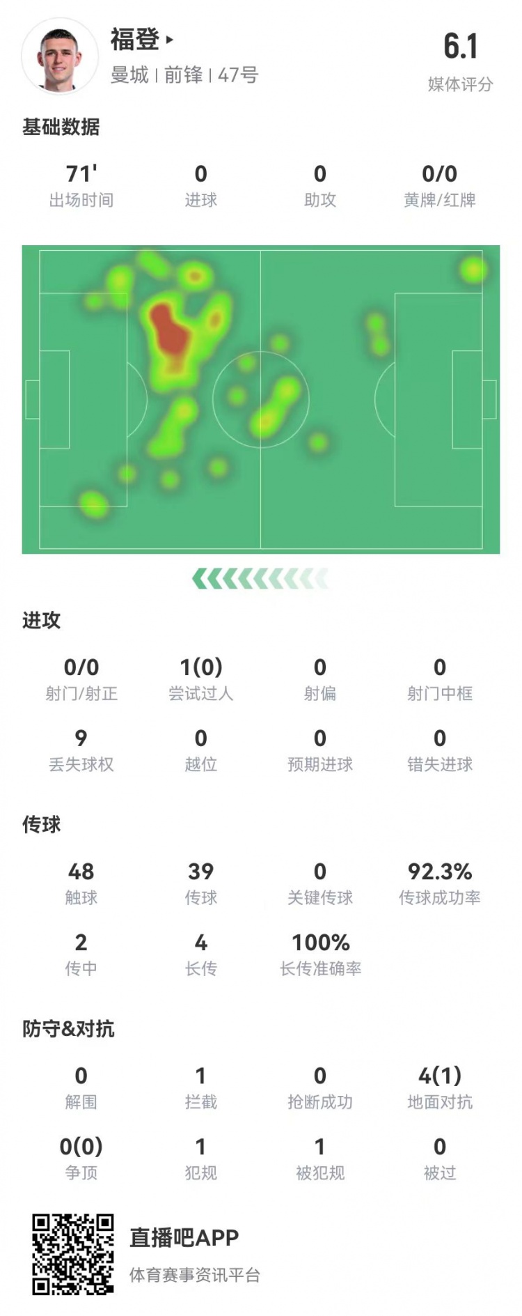 福登本場0射門0關(guān)鍵傳球 4對抗1成功 1失誤導(dǎo)致丟球 獲評6.1分