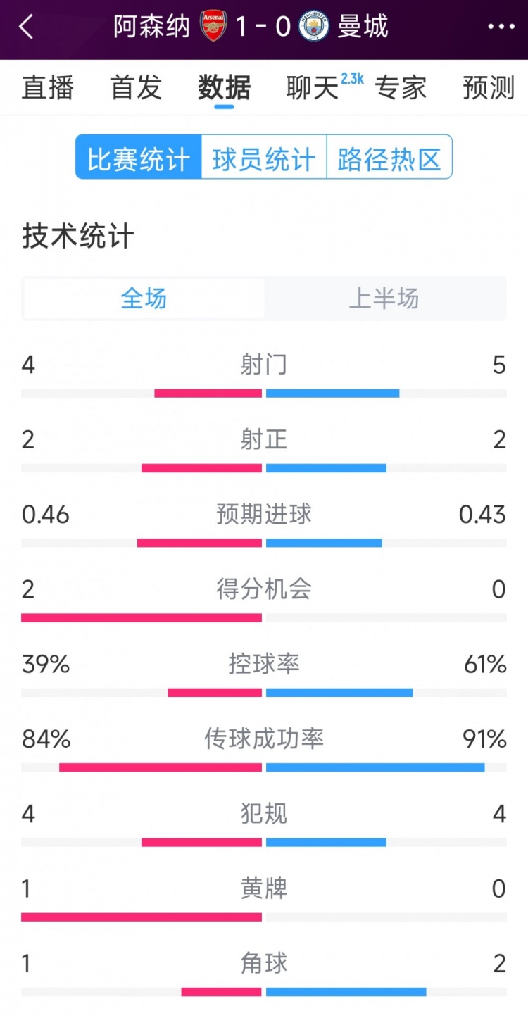 阿森納vs曼城半場(chǎng)數(shù)據(jù):射門4-6,射正2-3,得分機(jī)會(huì)2-0