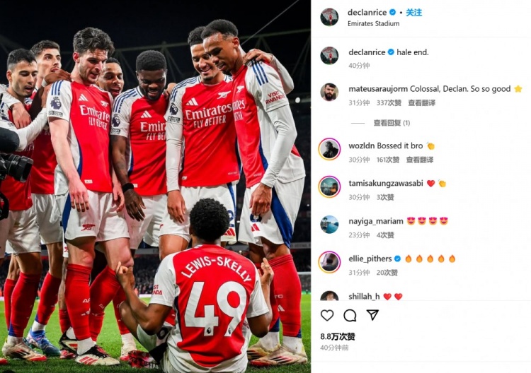 賴斯也在賽后通過(guò)社媒曬出自己和隊(duì)友們圍觀小將斯凱利打坐慶祝的照片,并配文:“黑爾恩德?!?/p>