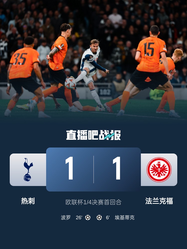 埃基蒂克首開紀錄,波羅扳平比分,最終熱刺首回合1-1戰(zhàn)平法蘭克福。