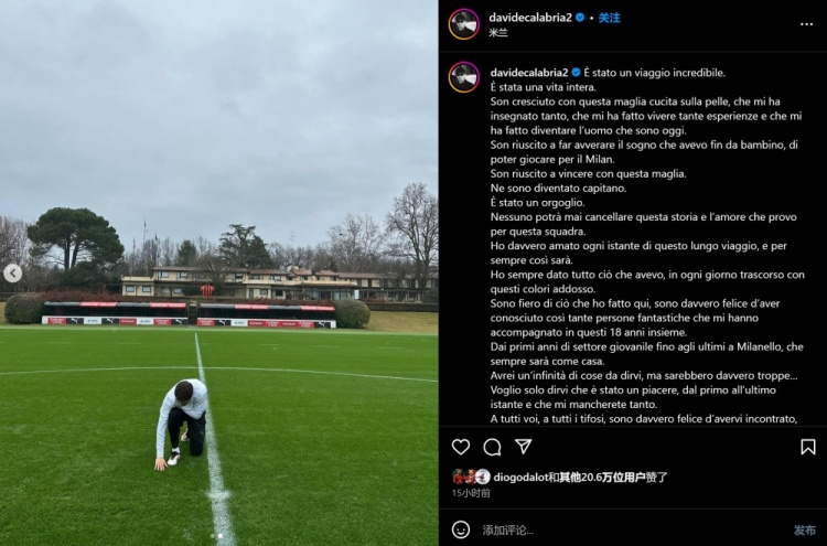 2月3日訊 米蘭前隊(duì)長卡拉布里亞即將離隊(duì),加盟博洛尼亞。他更新了社交媒體,寫下長文向米蘭告別。